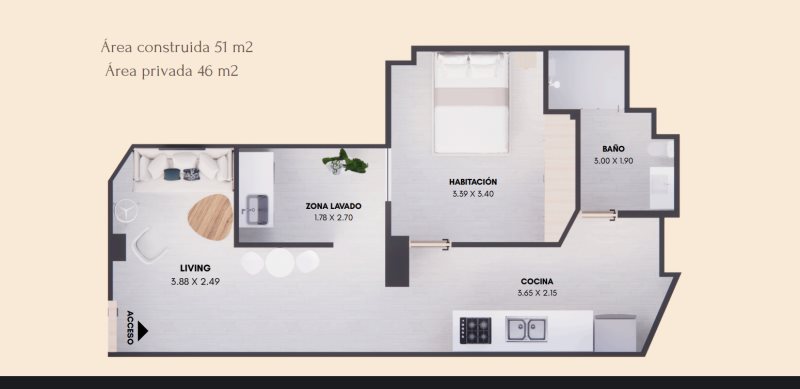 • 45 m² construidos / 40 m² privados; 1 habitación y 1 baño; $192.000.000 Interno