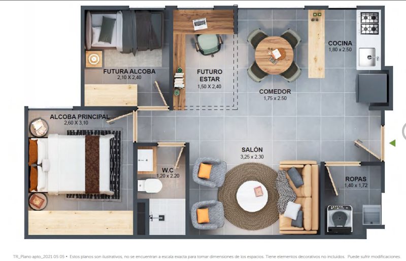 El apartamento se entrega en obra gris habitable, con un diseño funcional y adaptable a tus gustos, y ofrece un espacio integrado de salón-comedor, cocina abierta, baño social y de alcobas, además de un ambiente flexible que puede funcionar como una o dos alcobas más estudio.
