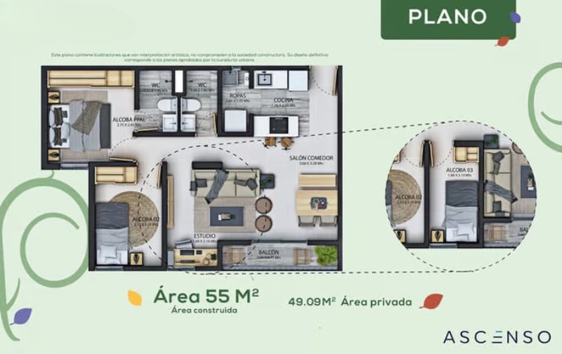 El inmueble estará distribuido en tres habitaciones, dos baños, sala comedor, espacio para cocina, zona de ropas y balcón, y se entrega en obra gris, lo que permite adecuar los acabados al gusto del comprador